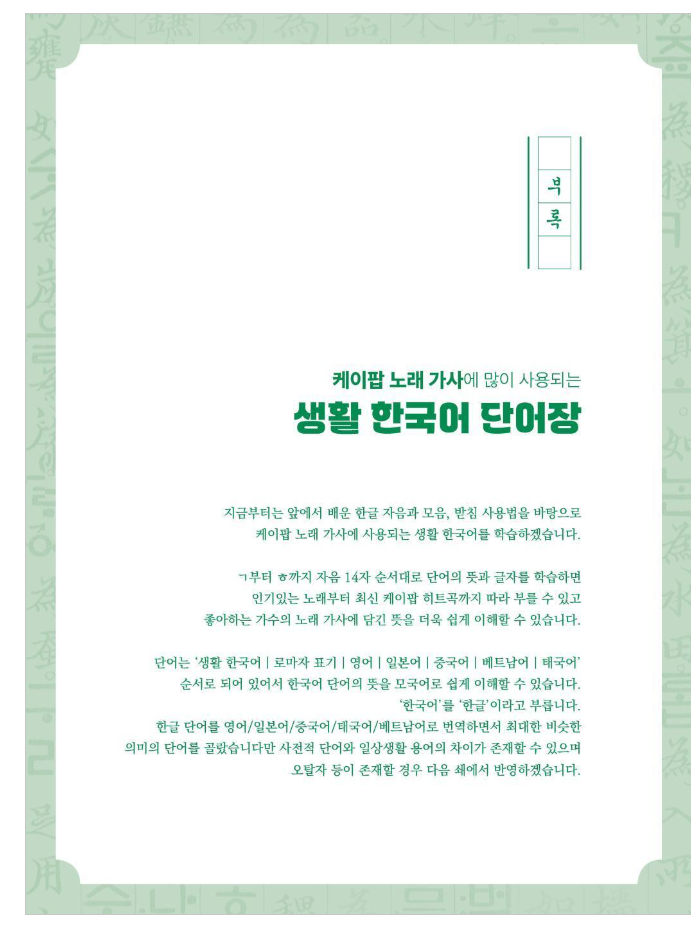 특히 이 책에서는 케이팝 노랫말 한글 단어들을 영어, 중국어, 일본어, 태국어, 베트남어로 해석을 넣었어요! 그래서 다문화가정 어린이들이나 결혼이주여성들이 한글공부하는데 재밌게 쉽게 배울 수 있을 것이고요, 중장년층이나 실버세대 어르신들께서 한글공부하시는데도 노랫말 가사를 먼저 익힐 수 있으니까 속도도 빠를 것 같아요! 한글학습을 빨리해서 어르신들이 좋아하시는 유행가도 부르시고 쓰고 내용 이해하고 그러실 수 있거든요!!