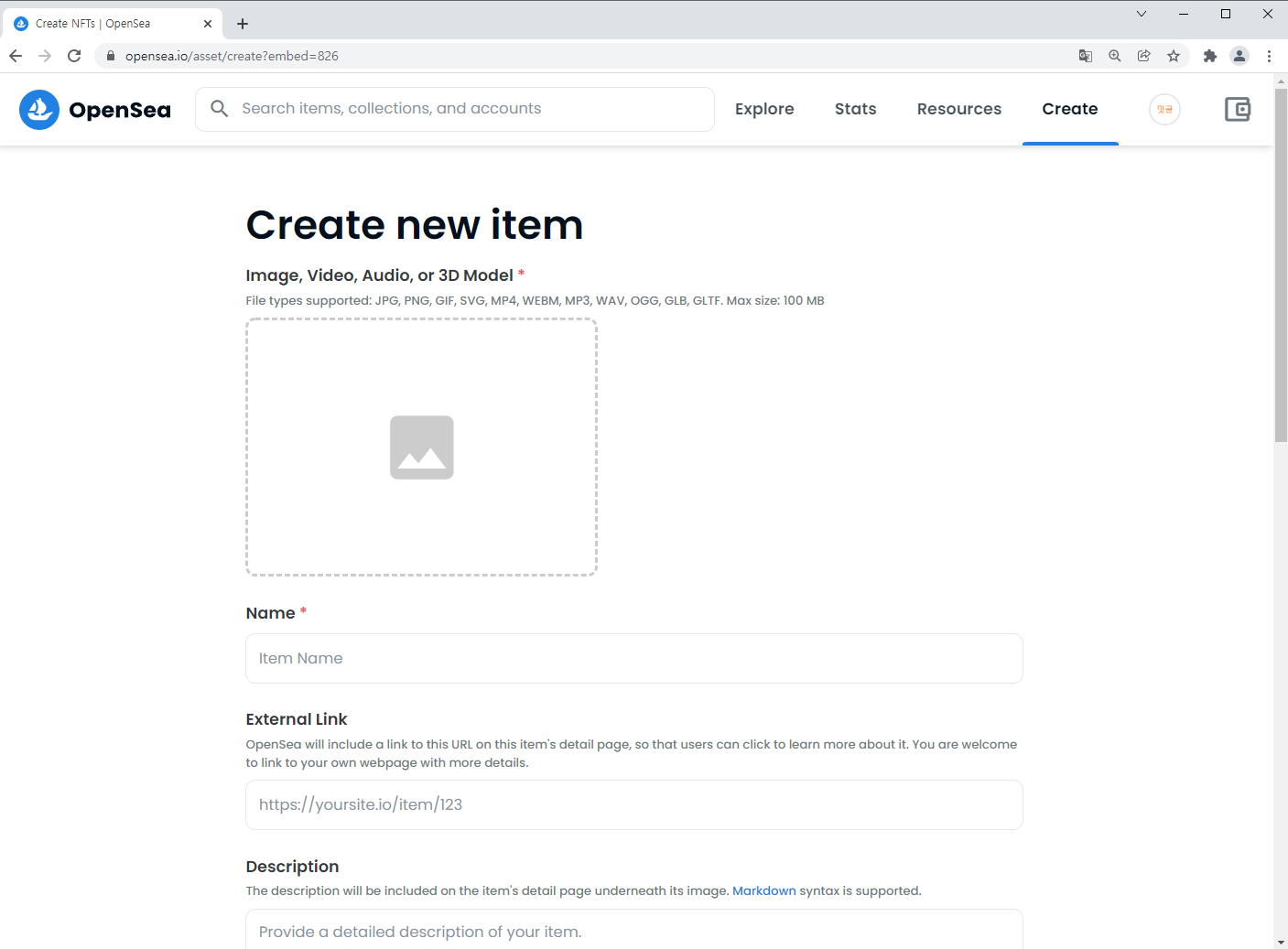 오픈씨에서는 디지털 이미지(Image), 동영상(Video), 소리(Audio) 또는 3차원 이미지(3D Model)로 제작된 가상자산을 NFT로 발행할 수 있습니다. 이 경우, 각 디지털 파일은 개당 100M 이하의 용량으로 형태는 JPG, PNG, GIF, SVG, MP4, WEBM, MP3, WAV, OGG, GLB, GLTF를 지원합니다.
